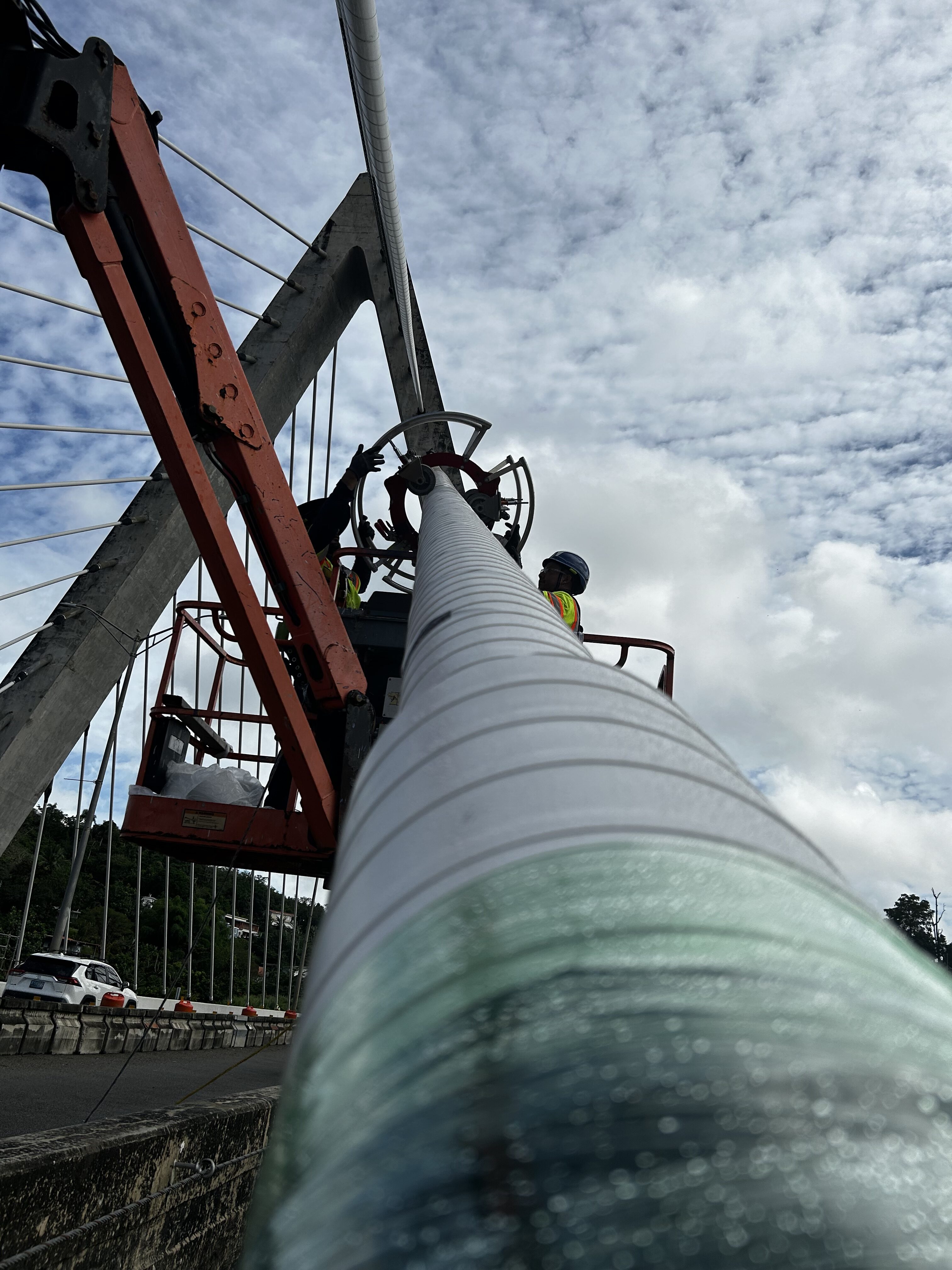 Currently, the Freyssinet team is performing elastomeric cable wrapping on all 96 cables and replacing all 96 lower and 96 upper neoprene boots. The next steps in the repair process include bearing resetting and PT inspection, scheduled to take place around August 2024.
