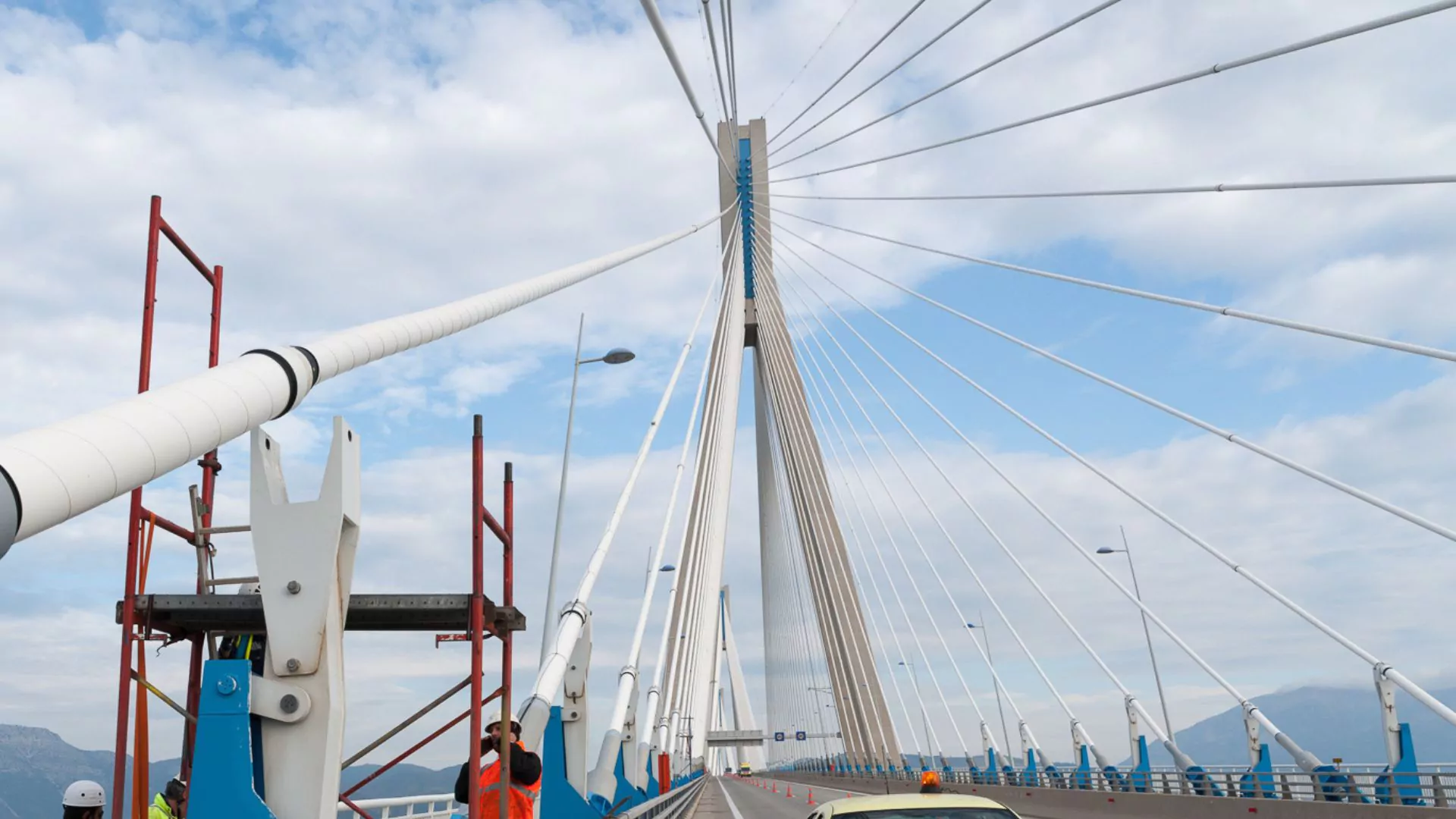 This 2,252m-long cable-stayed bridge is composed of three 560m-long main spans and two 286m-long side spans, carried by four pylons rising up to 140m above sea level.