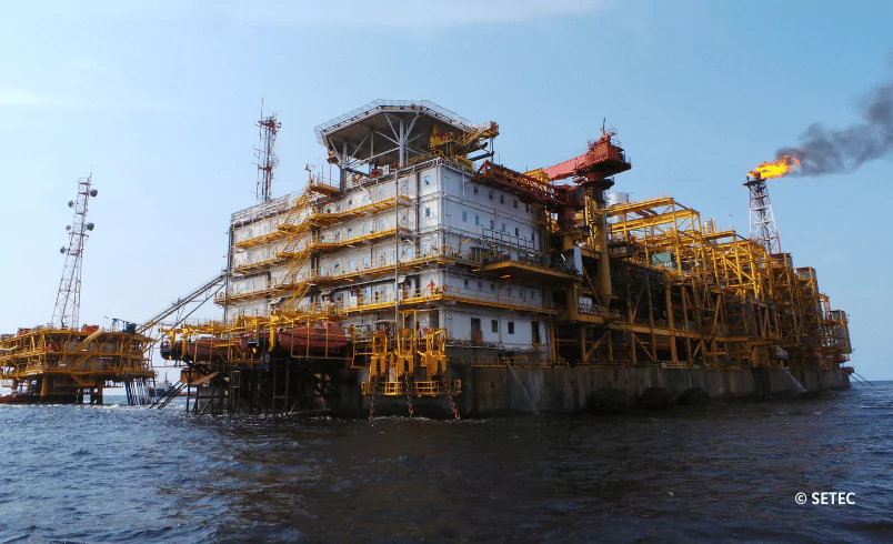 On one hand, constraints specific to an active offshore oil platform, namely ATEX classified zones, supply of materials by sea, restricted space on site, limited authorized people to work on the project, rotation shifts aligned with client requirements: 7 days a week, 12 hours a day with a 2-4 week rotation on the barge.